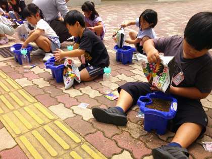 朝顔のたねを観察し、それぞれの植木鉢に種を植えました。芽が出るのが楽しみです。