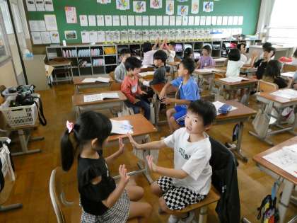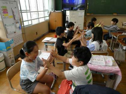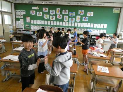 「はしの上で」と「たぬきのたいこ」の学習をしました。2拍子と3拍子のリズムの曲です。まずは、一人でリズムを打って楽しみ、そのあとは、ペアになって手遊びをしました。みんなにっこにこで楽しそうにリズムを打っていました。