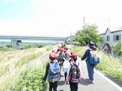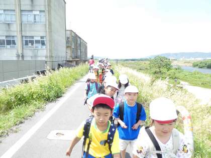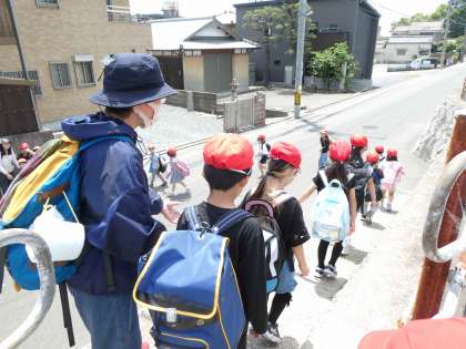 遠足が楽しみすぎて、1・2時間目は、なんだか上の空だったり、反対にテンションが高かったり…。教室で授業を頑張った後、インターロッキングに並んで出発です!