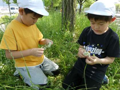 シロツメクサもたくさん生えていて、茎をつかってシロツメクサずもうをしたり、お花の輪っかを作ったり。腕輪や花かんむりができました♪