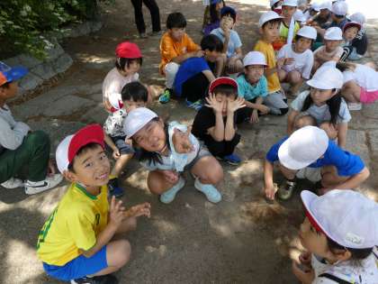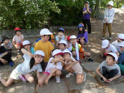 お昼ごはん前に集合ー!お弁当を食べるときの注意を聞いた後、手を洗うために待っています。ひと遊びした後で、みんな満足気。