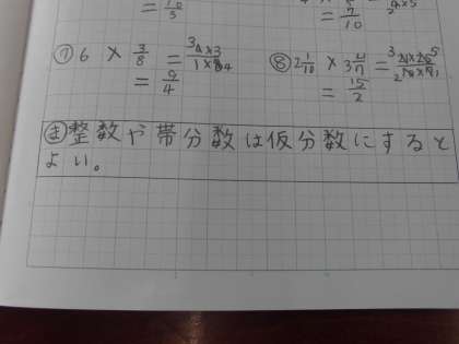 算数では、今まで習ったことを確認しながら分数の計算をしています。