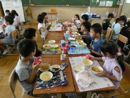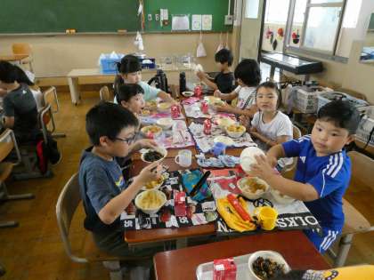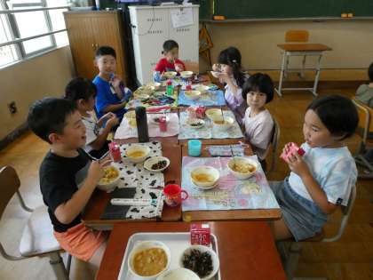 コロナ禍も明け、今日は机をくっつけて友達との談笑を楽しみながら食べました。今日の献立はカレーなので、お喋りを楽しみながらでもみんな時間内に食べきることができました。献立によって、こんなふうに食べる日も増やしていきたいと思います。