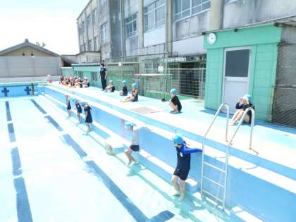 今年初めての水泳学習です。1・2年生合同での活動です。入水までの手順を思い出しながら、2年生がお手本を見せました。バディを確認して、相手の様子もチェックです。