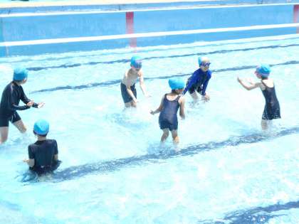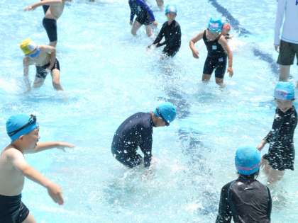 朝からプールを待ちわびていた子どもたち。今週は、低水位での活動です。「昨日、楽しみすぎて寝れなかったー!」という子もいました。バシャバシャ水がかかっても平気な子、顔を背けながらも相手に水をかけている子、みんな楽しそうでした。
