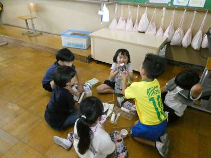 空き容器などを使って、どんなおもちゃが作れるか考えました。今日は、切ったりくっつけたりはせず、素材そのものの良さを使って何ができるか試してみました。振って楽器にしたり、転がしてみたり、積んでみたり…。子どもたちのおもしろい発想がたくさん見られました。