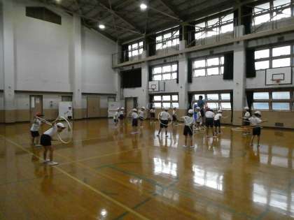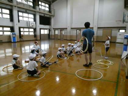 フラフープを使ってどんな遊びができるかを、自分たちで考えました。フラフープを転がして2秒後に追いかけて追いつけるか、や、誰が一番遠くに転がせるかなどいろいろなルールを考えて試しました。