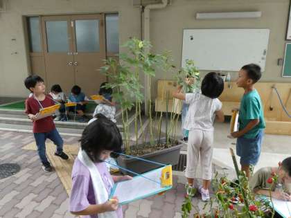 夏休み明けの野菜の様子を観察しました。夏休み前にたくさん実をつけていたきゅうりはもう枯れてしまっています。その代わり、オクラは少しずつ花をつけ、実ができてきました。ピーマンは、緑から赤色へ…。今までとの変化をたくさん見つけました。