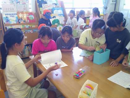 図書委員会では、100冊読書をめざして、10冊読むごとに図書委員が手作りしたしおりをプレゼントすることにしました。今日は、読書ノートを持って、たくさんの人が図書館に来てくれました。これからも、たくさんの人に読書に親しんで、図書館に来てもらいたいなと思います。