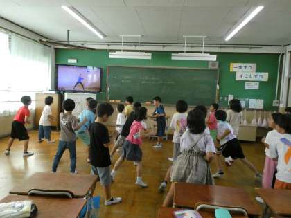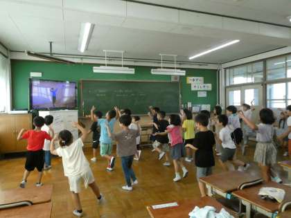 運動会のダンスの練習が始まりました。まずは、教室で動画を見ながら動きを覚えます。子どもたちは気に入ったようで、「休み時間にも練習したい!」と励んでいます。