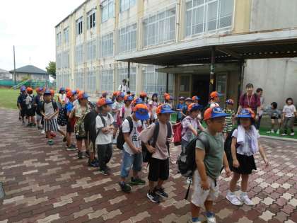 教室で遠足での注意を確認したあと、外に並んで出発です。いざ、京都水族館へ!!