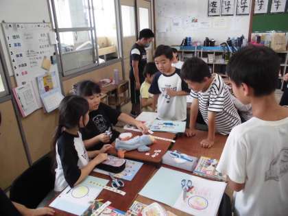 外国語で果物や野菜の言い方の学習をしています。自分の好きな果物や野菜を伝え合い、オリジナルピザを作りました。