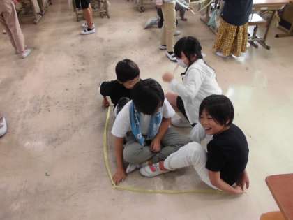 算数で面積の学習をしています。1平方メートルの広さを確かめ、1平方メートルの中に入れるかなど、実感していました。