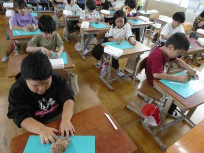 粘土を使って笑っている顔を作りました。たくさんこねて、粘土を柔らかくして準備万端。つまみ出したり、くぼませたりして口や目、耳を作ります。