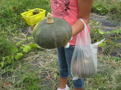 畑で育てていただいたカボチャが実ったので4年生が収穫に行きました。見た感じではどこにあるのかわかりません。みんなよーくさがして自分の顔ぐらいあるカボチャを採っていました。最後はみんなで記念写真!!高須さん,狭間さんありがとうございました。