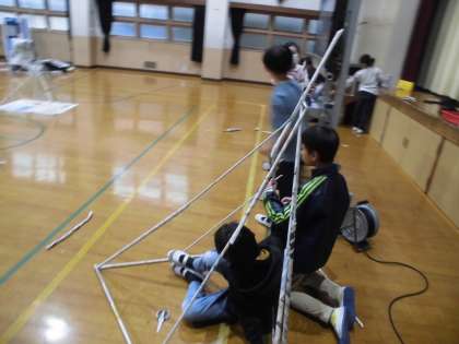 図工で「つなぐんぐん」をしました。新聞を細長く丸めてつないで、テントやタワーをつくりました。うまく工夫してつないでいました。