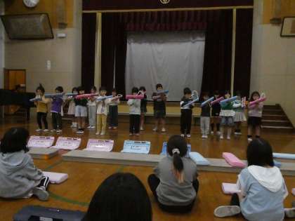 広い体育館での発表会。緊張しながらも、練習を繰り返すうちに少しずつ大きな声が出るようになってきました。