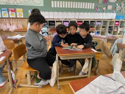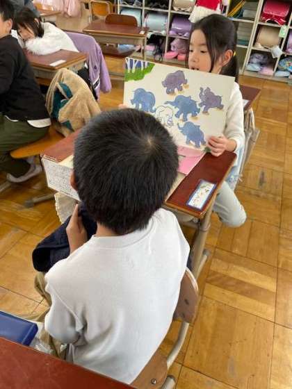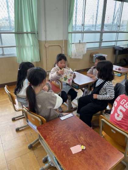 1年生の楽しみの一つ、読書の時間です。お話をしながら友だちと一つの本を読んだり、紙芝居をしてみたり、それぞれの楽しみ方があるようです。今は本の楽しさを存分に味わってほしいと思います。