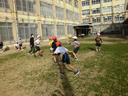体育の陣取りゲームでタグラグビーをしています。タグを取られないように、うまく相手をかわしたり、パスをつないだりしてボールを前に運ぶことを頑張っています。