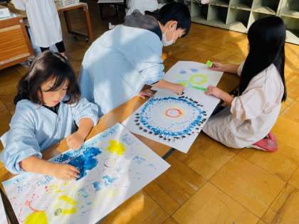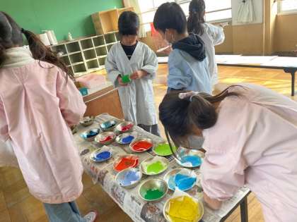 今週の図工は身の回りの物をスタンピングして楽しむ、「うつした かたちから」でした。作業用のエプロンを着て、集中して取り組みました。段ボールのギザギザを使ったり、洗濯ばさみを使ったり、ガムテープの芯にプチプチを巻き付けて転がしたり、それぞれに工夫していました。個性的な作品がたくさんできました。