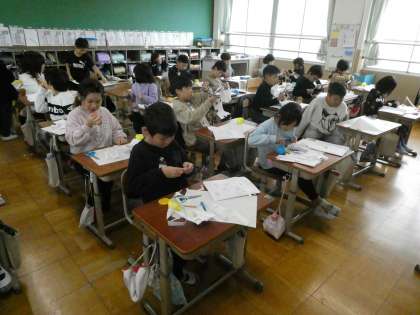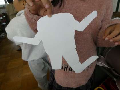 図工では、紙はんがを作成中です。目や鼻、まゆげ、上半身や上腕、太もも、ひざ下など、それぞれのパーツを作って組み合わせて、動きのある形を作っているところです。