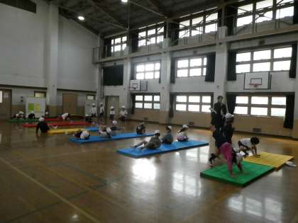 マットあそびの運動です。背中を丸めて転がったり、ブリッジをしたり体をほぐす準備運動中です。