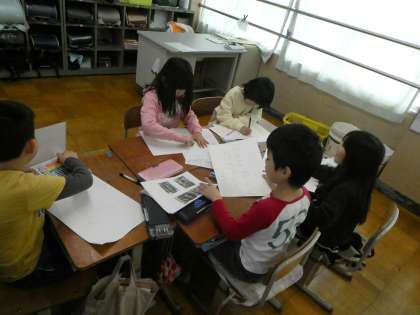 インタビューして分かったことをクイズにしたり、短くまとめたりして、画用紙に書いていってます。グループで役割分担をして、協力して進めています。