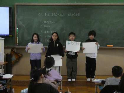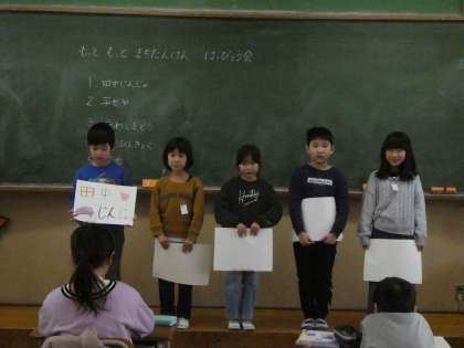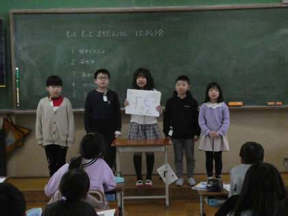 自分たちがインタビューしたお店などについて、ほかのグループに分かったことを発表しました。インタビューで分かったことをクイズ形式にしたり、短い言葉でまとめたりしています。聞いている人たちも真剣で「へぇー。」「そうなんだ!」など小さい声で感想がもれていました。(写真が暗く見づらいです。)