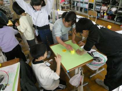 完成した紙はんがに台紙をつけました。刷った紙は、画用紙よりも大きくて薄いので扱いが難しいです。友達と協力して台紙に張り付けています。
