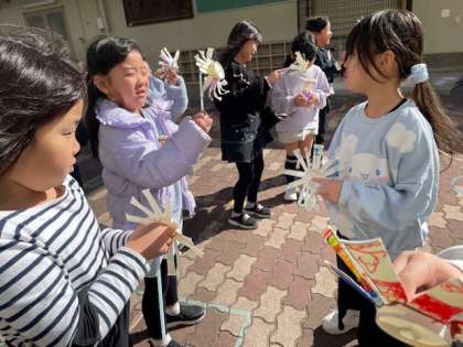 生活科では紙コップでつくった風車で遊びました。風がとても強くよく回っていました。
