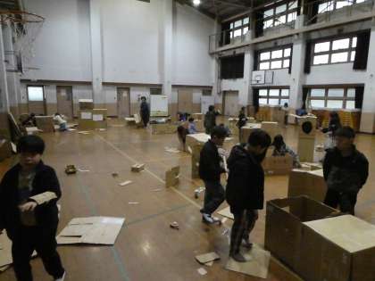 事前学習で、何を作りたいか、どんな材料が必要かを考え、今日は体育館を貸し切っての活動です。自然とグループを作って、作り始めました。