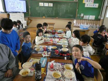 友達と机を合わせて給食を食べました。