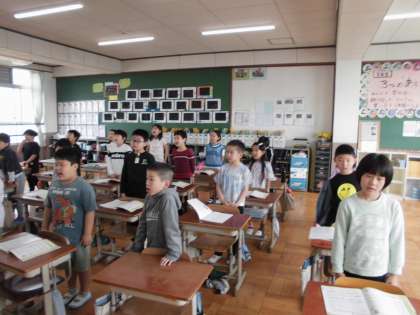 音楽では「ハッピーソング」と「春の小川」を歌いました。ハッピーソングは元気に!リズムよく!春の小川は明るく。少しゆったりと…。工夫をしながら歌うことができました。