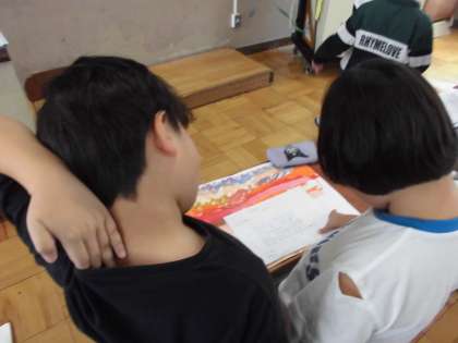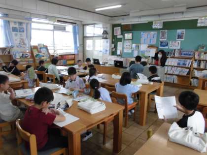国語科「図書館たんていだん」では、司書の先生から本の分類について教えてもらいました。ラベルの書き方もばっちり覚えたようです。