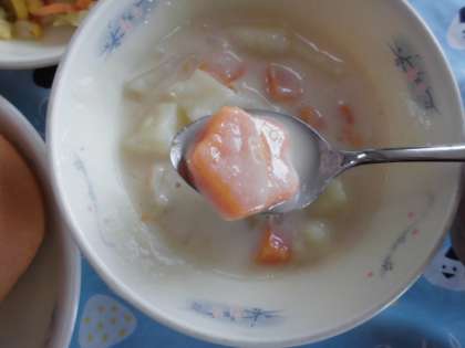 今日は大好きなじゃがいものクリームシチュー!ラッキー賞はだれの手に…。みんなで美味しくいただきました。