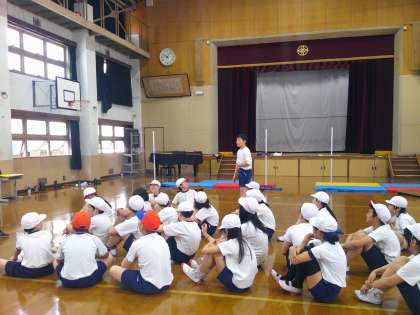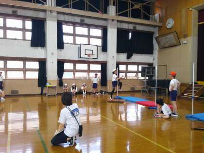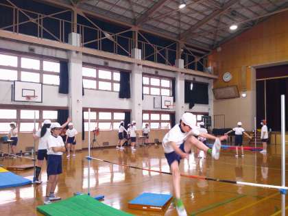 体育科の学習で、走り高跳びに取り組んでいます。めやすの記録に向けてチームの仲間とアドバイスをしあいながら頑張っています。