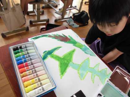 図画工作科ではお気に入りの葉の絵を描きました。河川敷に取りに行った葉をよく見て、描くことができました。お友達の絵を見て、「その色、どうやって作ったん?」など聞き合う姿がとても素敵でした。味のある絵が出来上がったので、みんなで見合うのが楽しみです。
