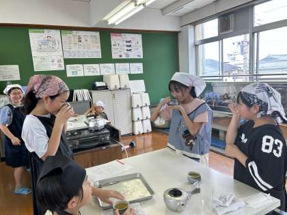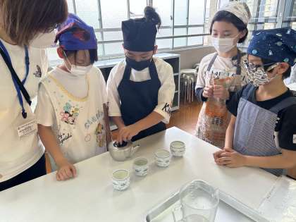 5年生から家庭科の学習がはじまりました。今日は、はじめての調理実習で、お茶を入れました。茶葉をはかって、お湯を沸かして、急須にいれて・・・とみんなで役割分担をしてお茶を入れることができました。はじめて自分たちで入れたお茶は少し、苦いと感じた人もいたようですが、みんな楽しそうに、自分たちで入れたお茶を飲んでいました。