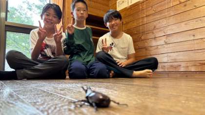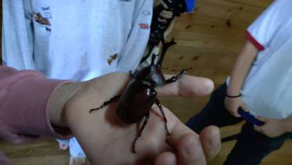 朝、カブトムシが部屋の網戸に遊びに来てくれました。