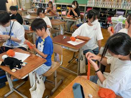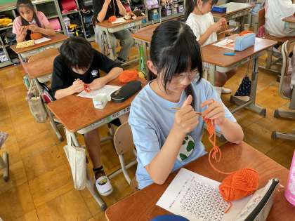 手芸クラブでは、編み物をしています。毛糸を使って、指編みやかぎ針編みをしています。難しいかぎ針編みに初挑戦している人もいます。みんな、真剣に集中して取り組んでいます。さすが、高学年です!!