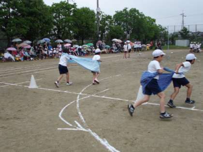 3・4年団体競技「心をひとつにデカパンリレー」です。