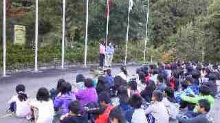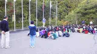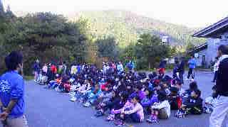 おはようございます。花背山の家の活動も2日目を迎えました。5年生は元気に活動しています。朝7時から玄関前広場で,横大路小学校と大枝小学校と吉祥院小学校の3校で朝のつどいをおこない,学校紹介をしました。