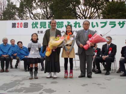 ・11月23日(金)今年は鳥羽離宮跡公園で「伏見西部ふれあいプラザ」がおこなわれました。今年も門川市長にお祝いの花束を本校3年生の児童が渡しました。