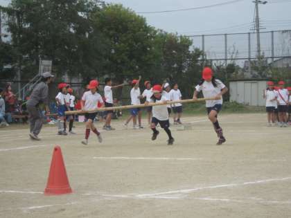 3・4年生の棒引きは総力戦や一騎打ちなど多彩な戦い方で会場を沸かせました。台風の目は1年生から6年生が力を合わせて棒をリレーしました。コーンの回り方もうまくいきました。5年生の100m走ではさすが高学年といった走りを見せてくれました。