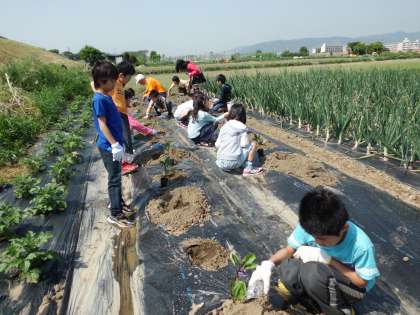 横大路の里では,狭間さんが用意していただいていて,キュウリやナスを一人一株ずつ植えました。ペットボトルに入れて持っていった水を忘れずあげていました。