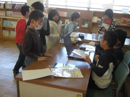 小学校での本の貸し出しは中間休みとお昼休みに図書委員会の子ども達が行っています。本には1さつ1さつにバーコードがついており委員会の担当児童がその本をコンピュータに入力し,貸し出し状況を確認して本を貸し出ししています。また,本を新たに借りる時は自分の貸し出しカードのバーコードをコンピュータに認識させてから借りられるようになっています。コンピュータ操作はすべて子ども達で行います。以前の図書カードのように本の題名などを書いておく必要がないのでとても早く手続きができます。本当に便利になりました。本の大好きな子ども達が増えてくれるのを願っています。
