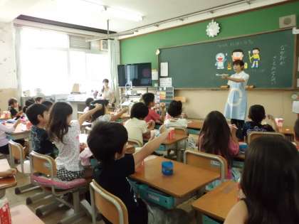 1年生は,歯科衛生士さんの指導を受けて,歯の働きや歯のみがき方について学習しました。のびた君が虫歯になったのはどうしてか?ドラエもんが教えてくれた大切なことは?自分たちが,いつまでも健康な歯をもっているために,今日から実践していくことをたくさん教えていただきました。