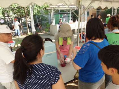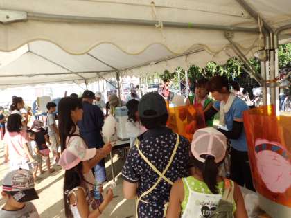 魚つかみでつかんだ鮎を焼いてもらうコーナー。綿菓子のコーナー。かき氷のコーナー。そして,タコせんコーナー。焼きそばやフランクフルトのお店。冷えたジュースをいただくコーナーなどに子どもたちは,それぞれチケットを持って集まりました。