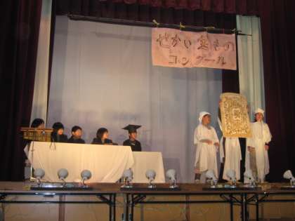 ここは「世界宝物コンクールの会場」。自分たちの宝物こそ「世界の宝物」と各国から宝物を持って集まりました。でも1位にかがやいたのは子ども達でした。みんなしっかりセリフがいえました。