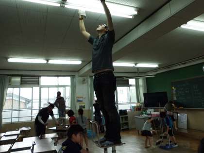 朝からの雨のため,外での清掃活動は中止して,校舎の中の教室や廊下・階段などを子どもと一緒に掃除していただきました。教室の電球の汚れを落としたり,高いところの窓を拭いたり,扇風機の羽をきれいにしたりと日頃子どもたちではできないところをきれいにしていただきました。
